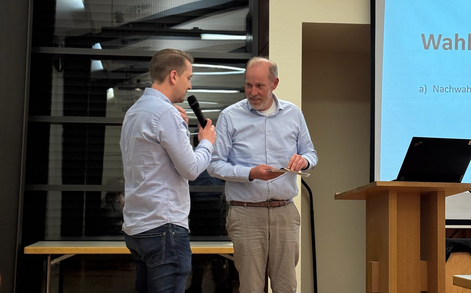 Daniel Schneider (links im Bild) bedankt sich bei dem scheidenden zweiten Vorsitzenden Florian Assfalg (rechts im Bild).